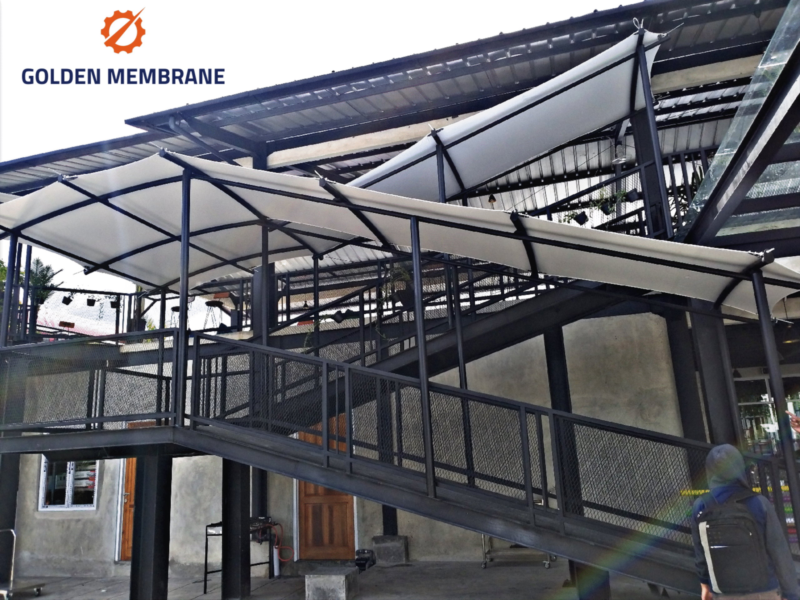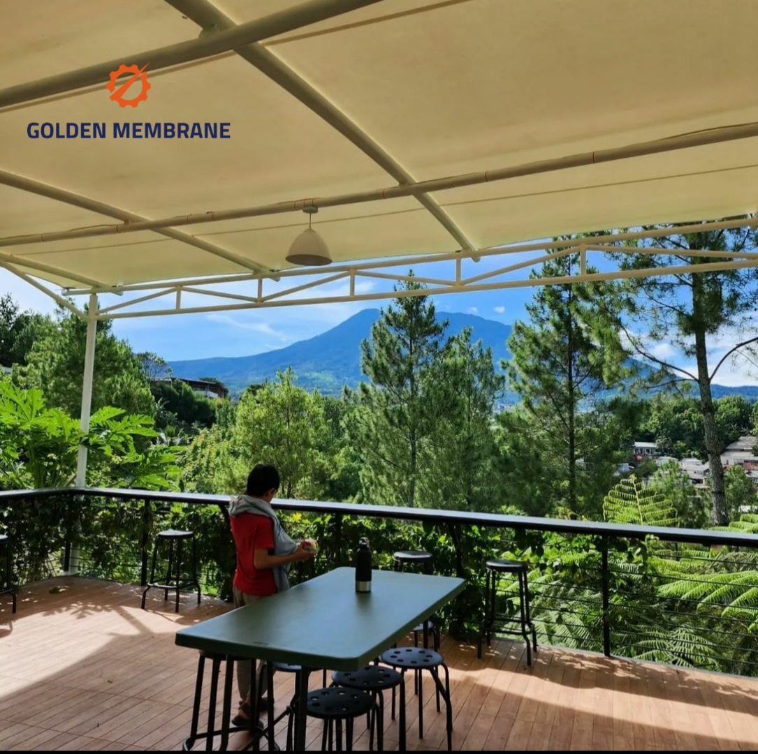 kanopi membrane tanpa tiang untuk melindungi teras rumah dari panas dan hujan